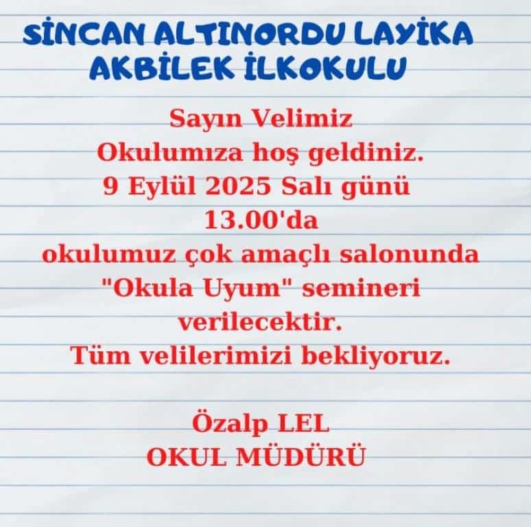 09 Eylül 2025 Salı günü, saat 13:00 da, okulumuzun A Blok çok amaçlı salonunda düzenlenecek olan seminere, tüm 1. sınıf velilerimizi bekliyoruz.